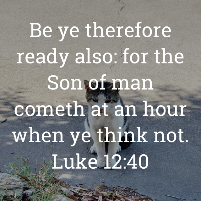 “Therefore be ye also ready: for in such an hour as ye think not the Son of man cometh.” - 1 Thessalonians 5:2 (KJV):