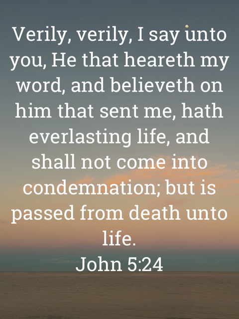 “Verily, verily, I say unto you, He that heareth my word, and believeth on him that sent me, hath everlasting life, and shall not come into condemnation; but is passed from death unto life.”