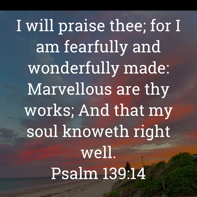 “I will praise thee; for I am fearfully and wonderfully made: marvellous are thy works; and that my soul knoweth right well.” (Psalm 139:14, King James Version)